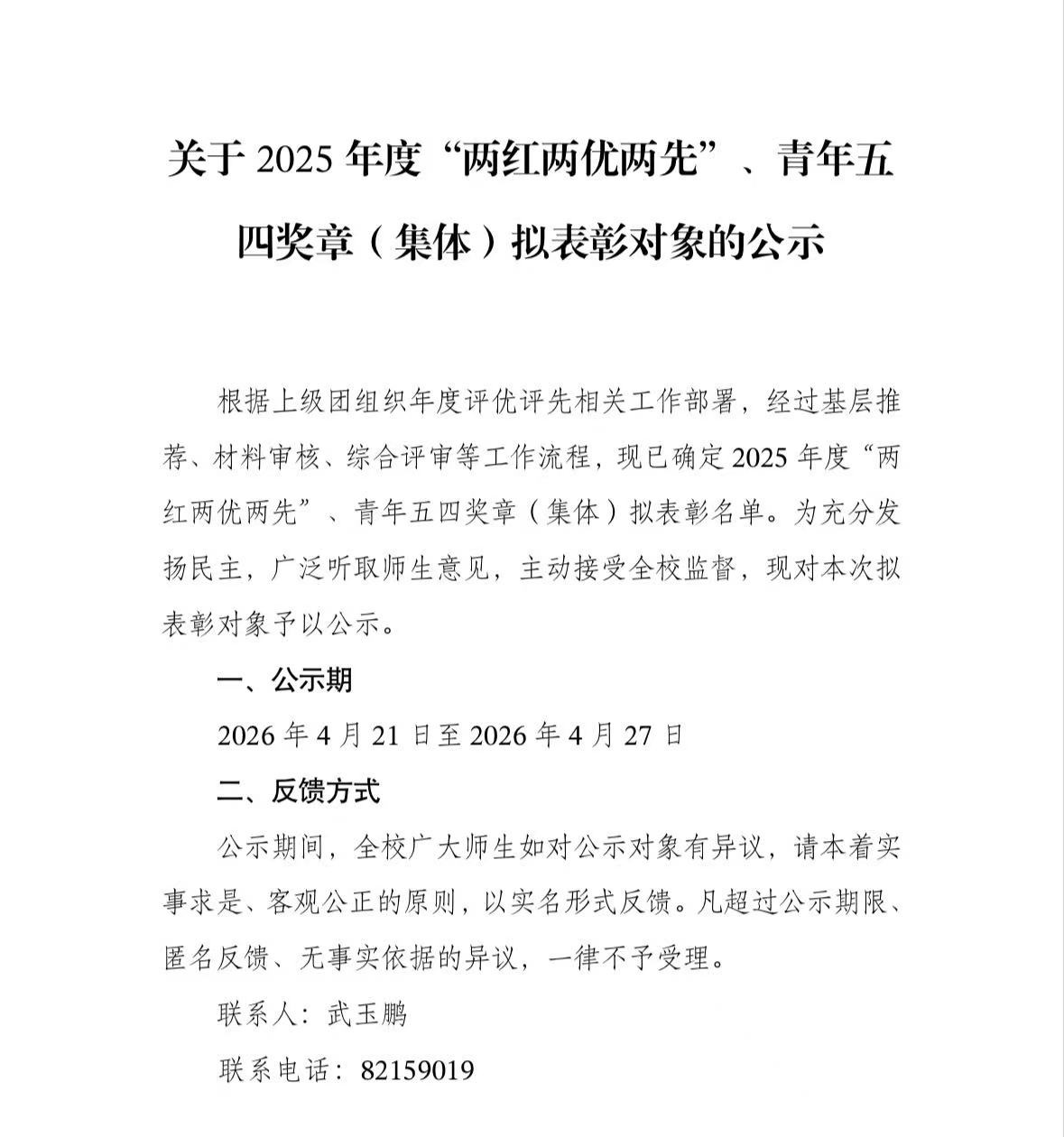 关于2025年度“两红两优两先”、青年五四奖章(集体)拟表彰对象的公示